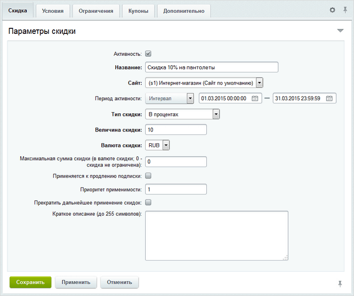 - Поле Краткое описание служит для задания краткого описания скидки. Размер описания не должен превышать 255 символов.