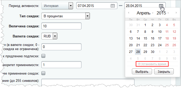 ВАЖНО! Будьте внимательны при настройке дат интервала действия скидки. Если в календаре у вас отключена установка времени, то в соответствующем поле будет установлена только дата без времени: