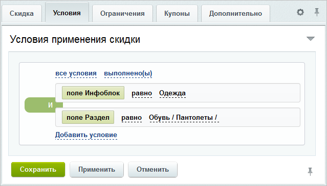 На закладке Условия задаются условия применения скидки. Укажем, что данная скидка может применяться только для раздела Пантолеты каталога Одежда. Для этого с помощью ссылки Добавить условие задайте соответствующие значения для поле Инфоблок и поле Раздел, соединив данные условия логическим И (все условия выполнены):