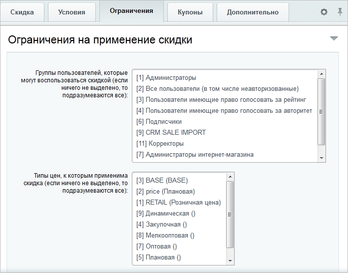 На закладке Ограничения можно указать группы пользователей, которые могут воспользоваться данной скидкой, и типы цен, на которые эта скидка распространяется: