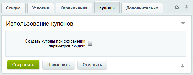 На закладке Купоны можно добавить купоны к скидке. Мы создаем скидку без купонов, поэтому опцию Создать купоны при сохранении параметров скидки оставляем неотмеченной: