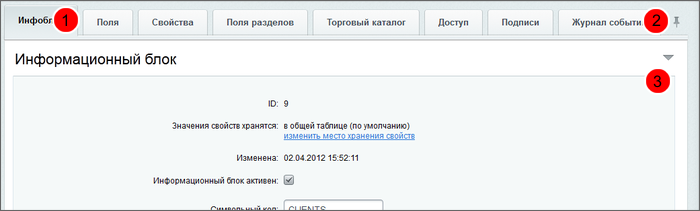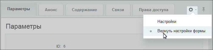Внешний вид формы можно настроить для удобства редактирования: изменить состав и количество вкладок и полей. (На данный момент это доступно только для некоторых типов форм: элементы инфоблока, разделы инфоблока и пользователи.) Для того чтобы вернуть вид настроек форме по умолчанию используется кнопка Отменить действие настроек формы на время сессии Отменить действие настроек формы на время сессии.