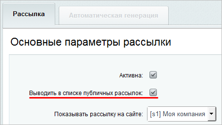 Чтобы предоставить пользователям возможность оформлять подписку самостоятельно, нужно разрешить доступ к подписке из публичного раздела. Для этого в форме редактирования подписки установите флаг в поле Выводить в списке публичных рассылок: