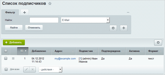 Подписчик может быть добавлен в систему администратором с помощью кнопки Добавить, расположенной на контекстной панели страницы Список подписчиков (Сервисы -> Рассылки -> Подписчики)