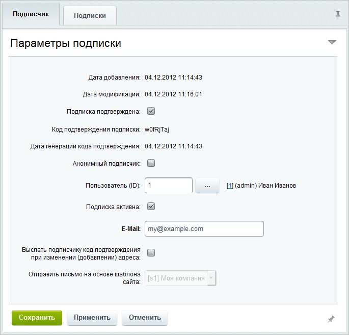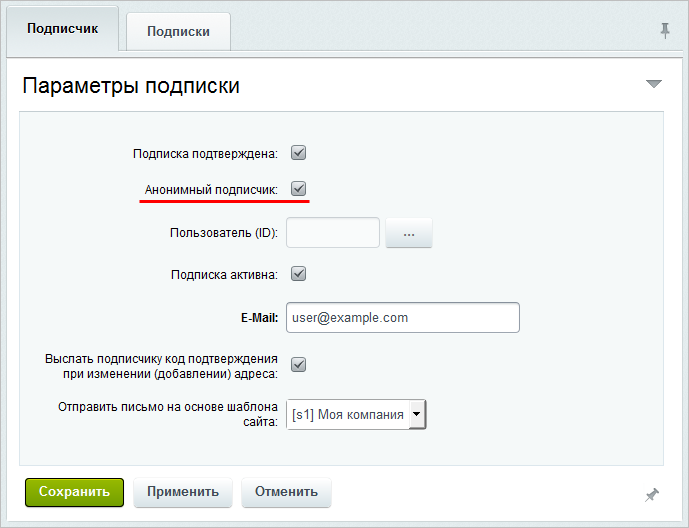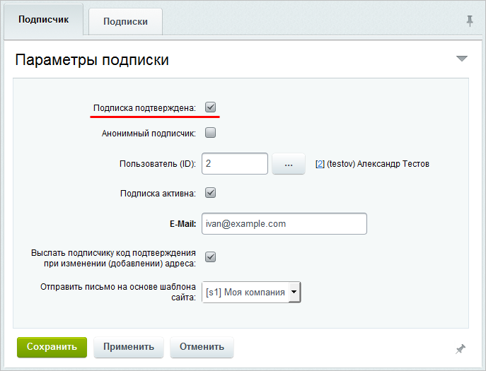 Примечание: Чтобы подписчик мог получать выпуски рассылок, Администратор должен подтвердить подписку, установив флаг в поле Подписка подтверждена.