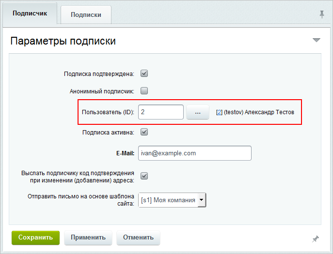 Если подписчик является зарегистрированным пользователем сайта, то ID пользователя вводятся либо прямым вводом в поле, либо с помощью кнопки из структуры сайта.