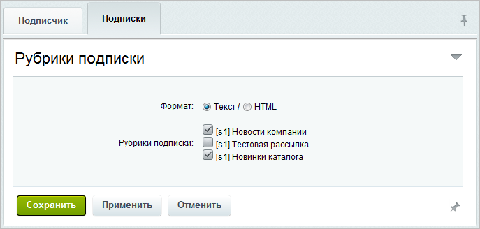 На закладке Подписки выбираются рассылки, на которые подписывается пользователь, а также формат отправляемых сообщений.