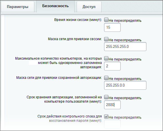 Для решения данной проблемы рекомендуется использование сочетания параметров закладки Безопасность (Настройки > Пользователи > Группы пользователей > {группа_пользователей}).