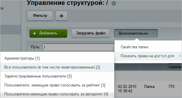 Настройка прав доступа к управлению структурой сайта выполняется в Менеджере файлов (Контент > Структура сайта).