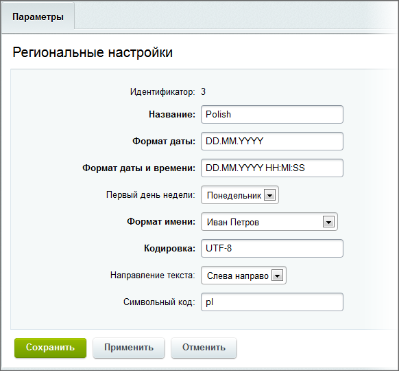 Информация о форматах даты и таблиц кодов, используемых для представления символов языка в публичном разделе сайта, приводится в документации продукта. В полях Формат даты и Формат даты и времени нужно указать системе, как отображать эти параметры. Установка этого параметра должна соответствовать параметрам даты и времени, используемым в настройке компонентов и при кастомизации. При различии этих параметров данные будут отображаться с ошибками.